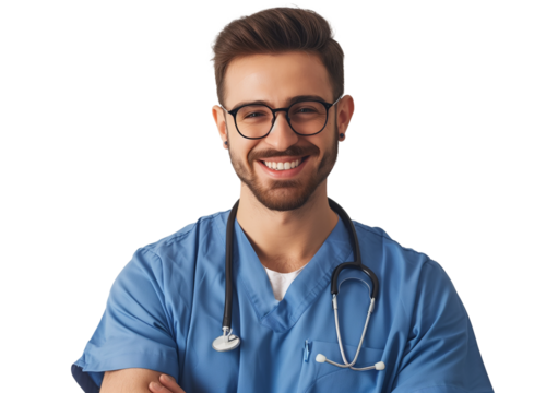 Portrait of a smiling young female doctor, standing confidently with arms crossed. She is wearing a professional medical uniform with a stethoscope draped naturally around neck. PNG file