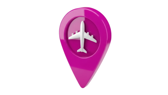 Magenta location pin with airplane isolated PNG, travel destination marker for maps and navigation on transparent background