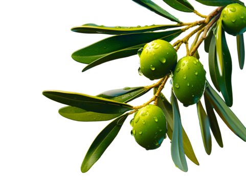 Branch of olive fruit with water drops and green leaves on blurred green background.
