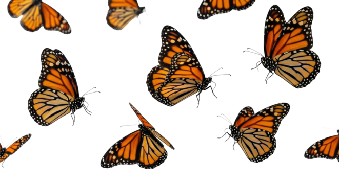 Multiple monarch butterflies with vibrant orange, black, white wing patterns in graceful flight against a transparent studio background with copy space, concept of natural freedom and beauty