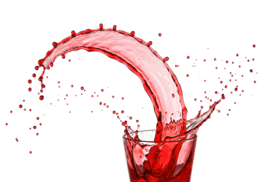 Scarlet red viscous liquid splash, frozen mid-air in a graceful arc with reflective micro-droplets, macro shot on a transparent studio background, concept for beverage advertising