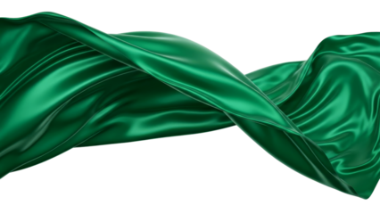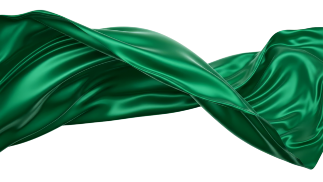Flowing green silk fabric gracefully drapes and twists, creating elegant waves and a luxurious, smooth texture that shimmers with vibrant color.