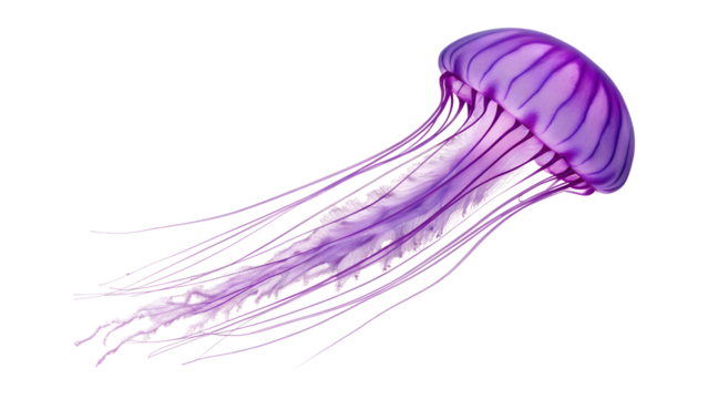 A luminous purple jellyfish gracefully swims underwater, its delicate tentacles trailing, isolated on a transparent png background.