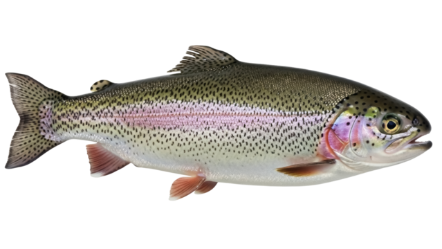 Isolated rainbow trout swimming gracefully with iridescent colors in natural lighting stock photo