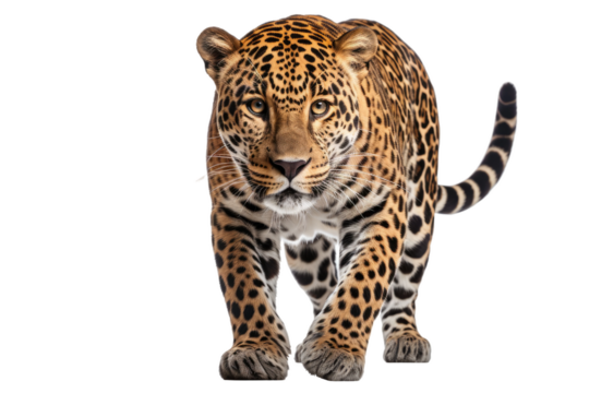 Large Leopard Walking Across White Background. On a Clear PNG or White Background.