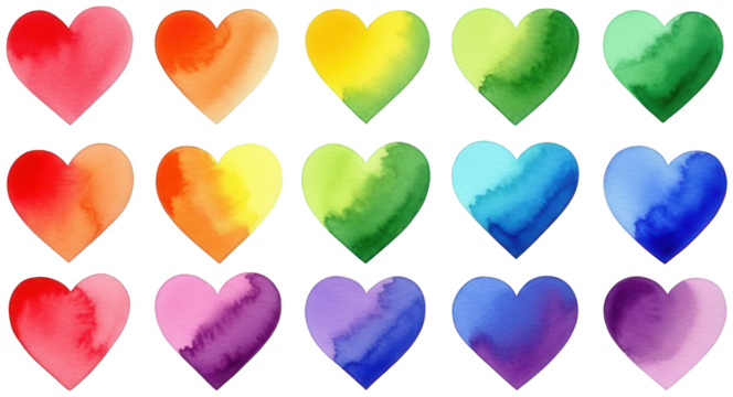 A vibrant collection of fifteen watercolor hearts, each displaying a unique gradient of color ranging from red, orange, yellow, green, and blue, rendered in a, isolated on transparent background.