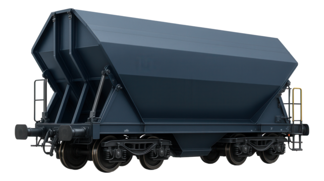 Hydraulic side panel train wagon with sloped interior for efficient self-discharge.