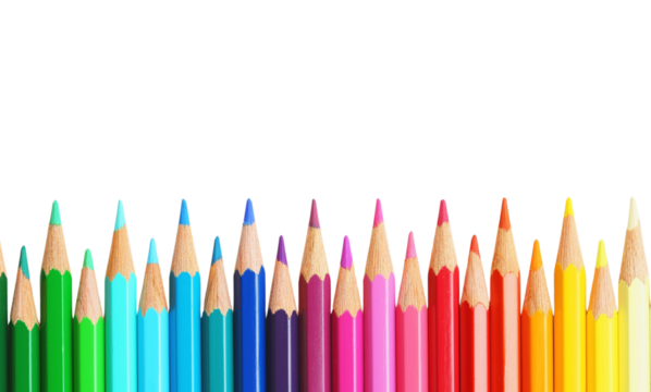 Brightly colored, sharpened pencils forming an undulating wave with a full color gradient against a transparent background, studio shot, concept of artistic tools and vibrant creativity