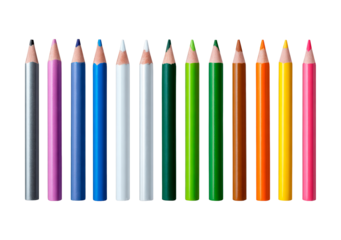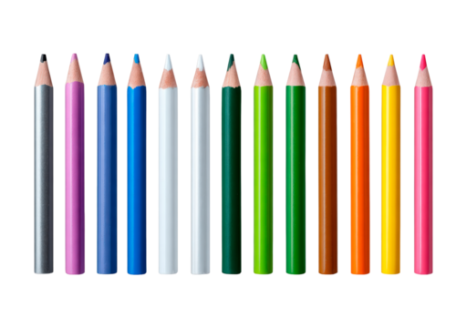 Colored pencils arranged diagonally in a neat row isolated on transparent background ideal for art education and design with copy space for text.