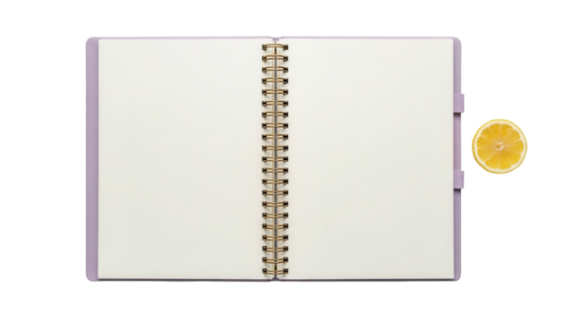 Isolated notebook with rings and blank paper pages for text plus lemon half in studio light