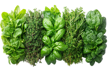 Fresh herbs including basil, thyme, and spinach arranged on a white isolated background.