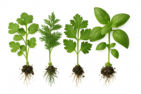 Fresh green herbs with roots. Basil, dill, coriander, and parsley seedlings ready for transplanting on transparent background