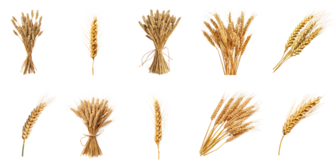 Various wheat ears on a white background.