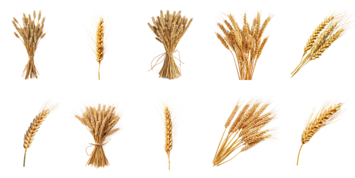 Golden wheat ears representing agriculture, food, and harvest. Healthy grain vector with transparent background
