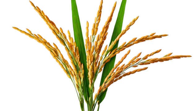 Ripe and Unripe Rice Stalks, with Green Leaves and Golden Grains, isolated on a transparent