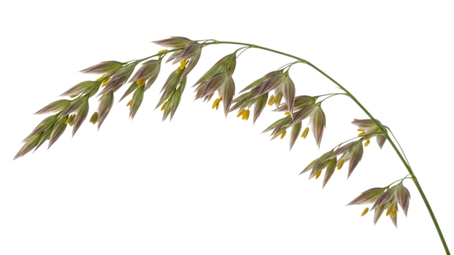 A single curved stalk of mature rice with golden grains hanging down, isolated on a white background