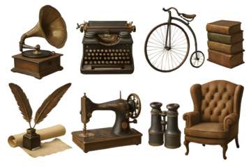 Hand-painted watercolor clipart set of retro and vintage domestic objects and analog media like a toaster, tea cup, camera, cassette tape, and gramophone in pastel colors.