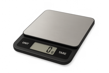 Digital kitchen scale displaying zero grams on transparent background