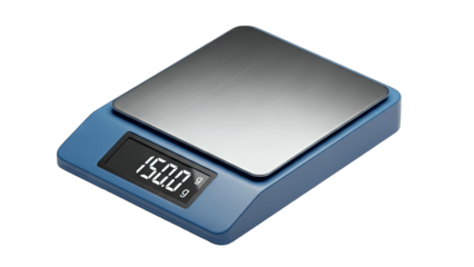Digital scale with LCD display showing weight measurements in black digits, silver casing, and sleek design isolated on transparent background.
