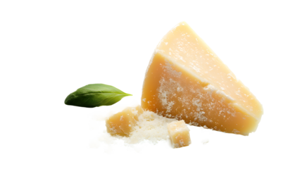 Parmesan cheese pieces with basil leaves isolated on white background. transparent PNG