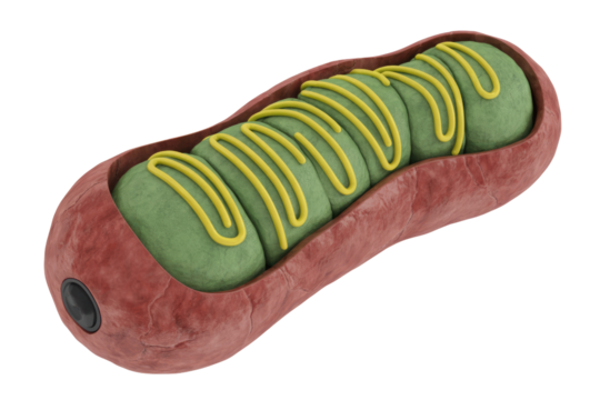3D rendering of a chloroplast showing green grana stacks inside a red membrane with yellow internal structures. background removed