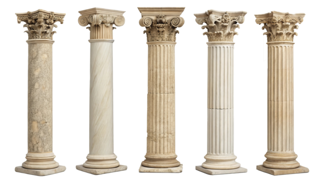 Four ancient architectural columns with different designs isolated on a white background showing classical style