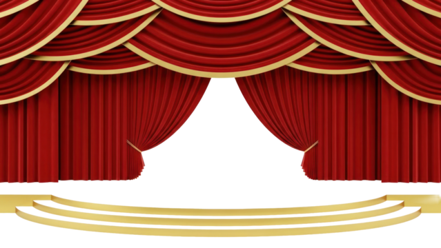 Red curtain covering a stage, creating anticipation for a theatrical performance, with transparent background