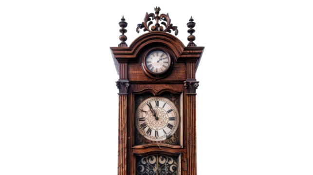 Antique grandfather clock with ornate wooden casing isolated on transparent background