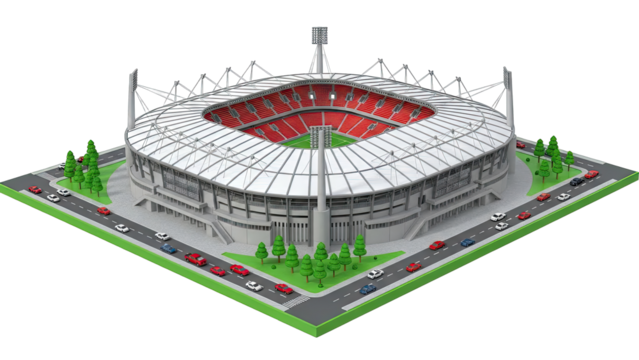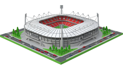 Detailed view of a modern soccer stadium at night isolated on transparent background