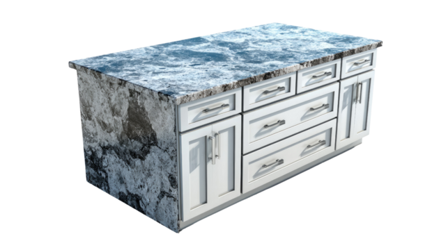 Modern white kitchen island base with multiple drawers and cabinets, topped with a distinctive blue-gray patterned granite or stone countertop. background removed