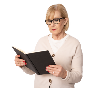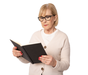 Image of aged woman with an open book isolated over transparent background. PNG transparent.