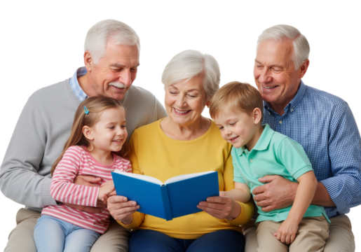 Grandmother and grandchildren reading book on transparent background