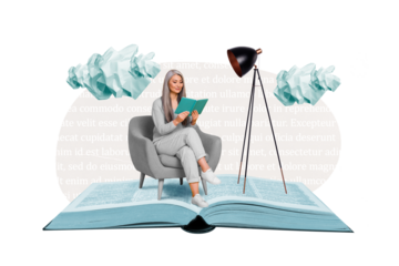 Collage poster banner of retired pensioner lady sit chair paper book page reading in comfort