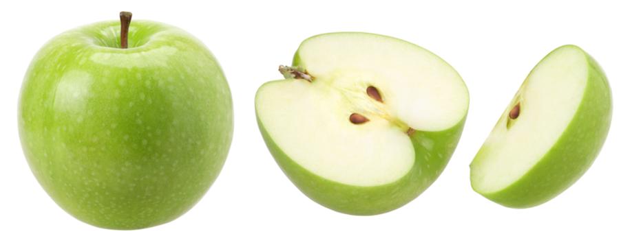 green apple (granny smith apple), half and slice isolated, transparent PNG, PNG format, cut out