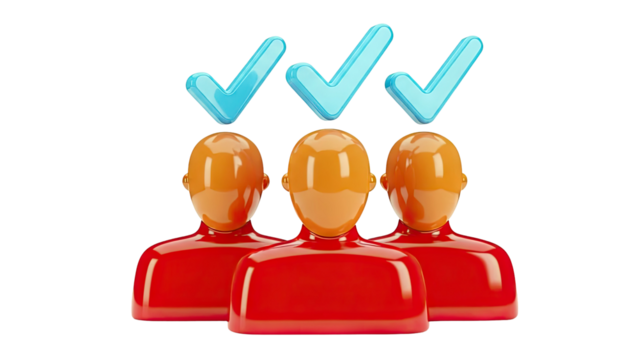 A 3D render of an orange, shiny checkmark against a stark black background. It appears three-dimensional and has a reflective finish