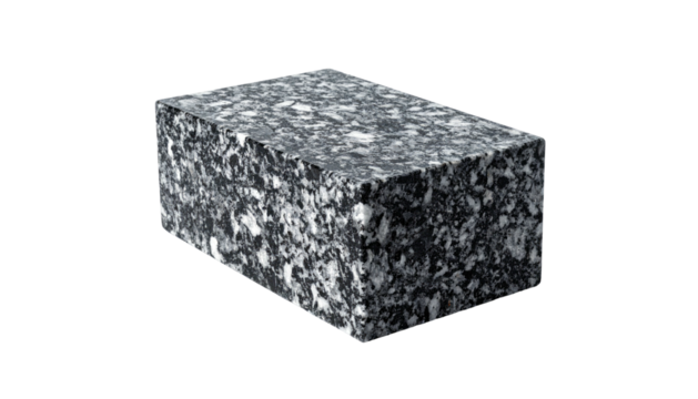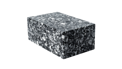 A rectangular block with mottled, granular texture against a stark black background