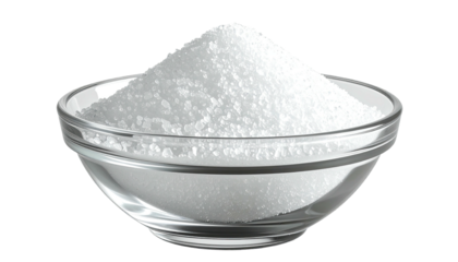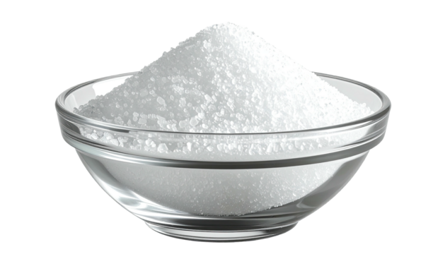 A transparent bowl filled with a large mound of white, granulated crystals against a black backdrop