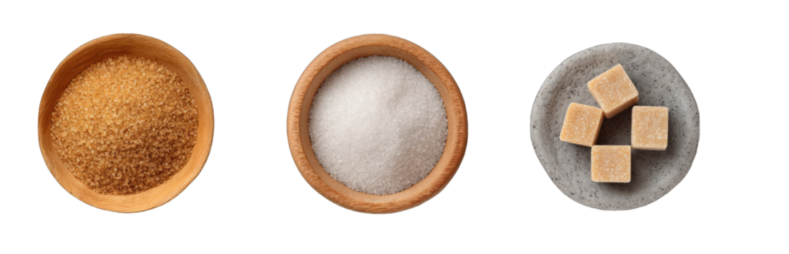 Wooden bowls of brown sugar, granulated sugar, and sugar cubes