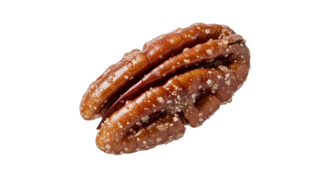 Studio shot showcasing a candied pecan with sugary granules against a pristine white background, perfect for autumn treats and delightful snacks