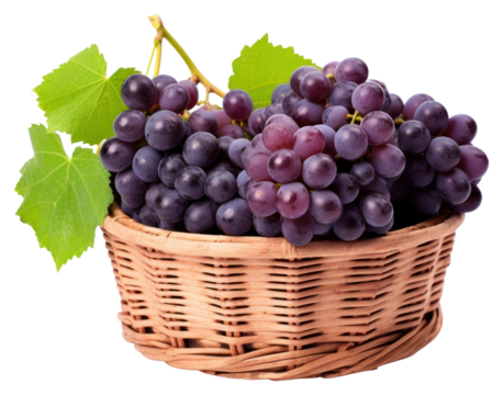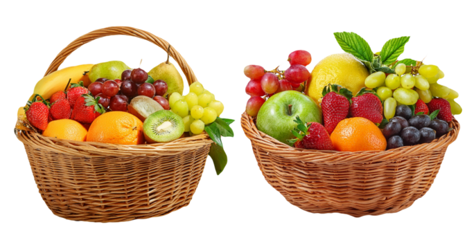 Set of baskets full with healthy fruits and vegetables, isolated on transparent background