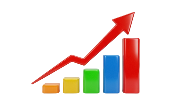 Colorful 3D bar graph with red arrow isolated PNG, business growth chart on transparent background for financial report