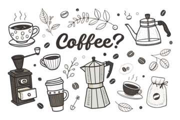 Hand drawn illustration of a vintage coffee grinder moka pot coffee beans and cups on a black background isolated on transparent background