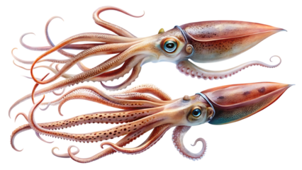Two detailed, realistic squid with tentacles spread, isolated on a transparent background, showcasing intricate textures and vibrant aquatic marine life.