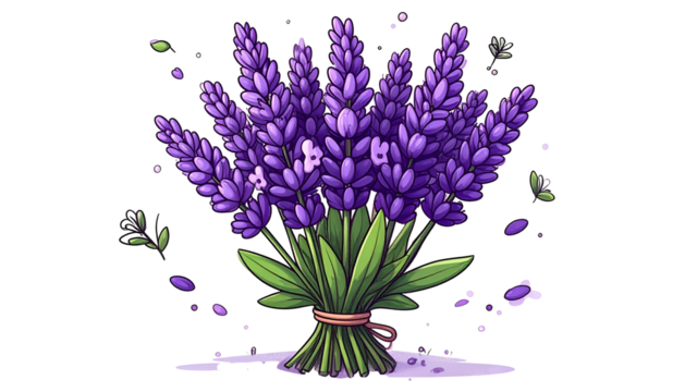 Cartoon depiction of a vibrant bouquet of lavender flowers tied together on a black background