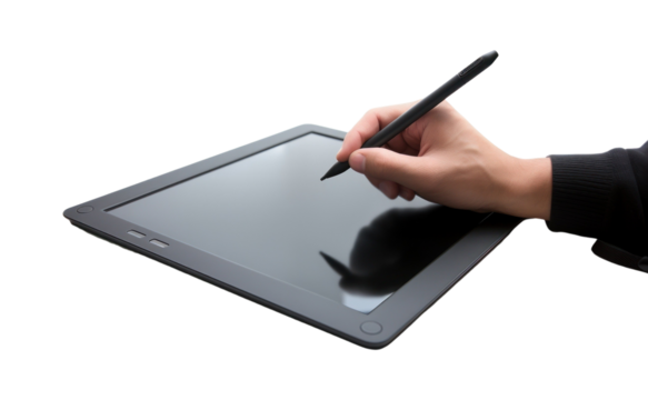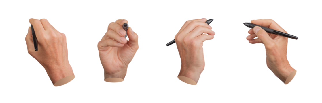 Hand holding pen, stylus for handwriting, drawing, set isolated on white background..