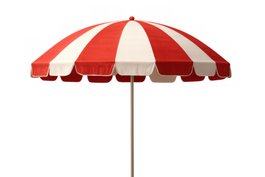 Classic red and white striped beach umbrella open, casting a shadow, isolated on a transparent background, perfect for summer and vacation themes