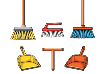 Illustrated Set of Cleaning Tools including Brooms Dustpans and Scrubbing Brush for Housework Graphics