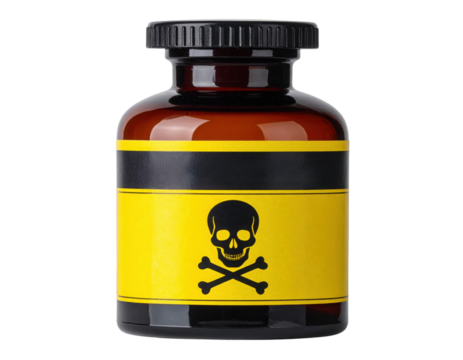 A dark amber bottle featuring a yellow label with a skull and crossbones, indicating a hazardous substance.