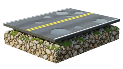 Cross-section of a road with puddles showing underlying stone and grass layer