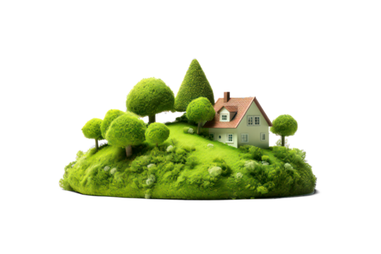 green hill with house and tree on transparent background, png file